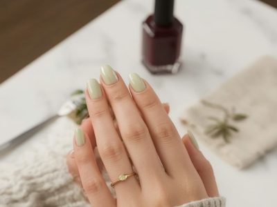Pistacjowy manicure ze szklanym połyskiem — wiosenna alternatywa dla burgundu