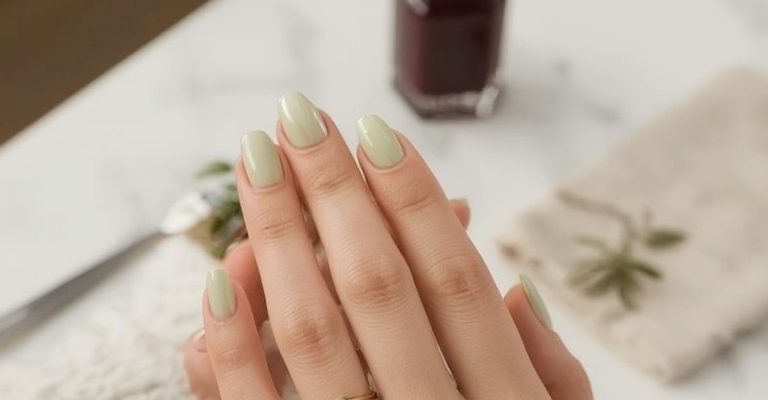 Pistacjowy manicure ze szklanym połyskiem łączy subtelny, wiosenny odcień pistacji z lustrzanym efektem „glass nails”, oferując lekką, elegancką alternatywę dla ciężkiego bordowego stylu na sezon wiosna 2025.